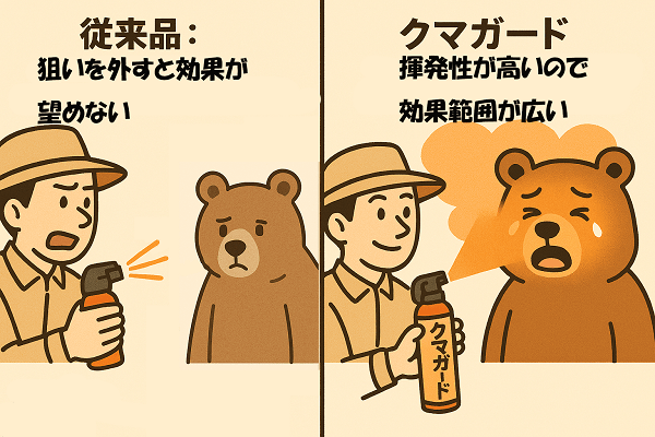 本スプレーは従来のカプサイシンスプレーと比べて優れている部分がいくつかあり、そのうちの一つが効果範囲の広さです。使用している成分のアリルイソチオシアネートは揮発性が非常に高く、熊の目や鼻に当たらなくとも、顔付近に与えれば成分が揮発するためクマに対しての催涙効果を発揮します。